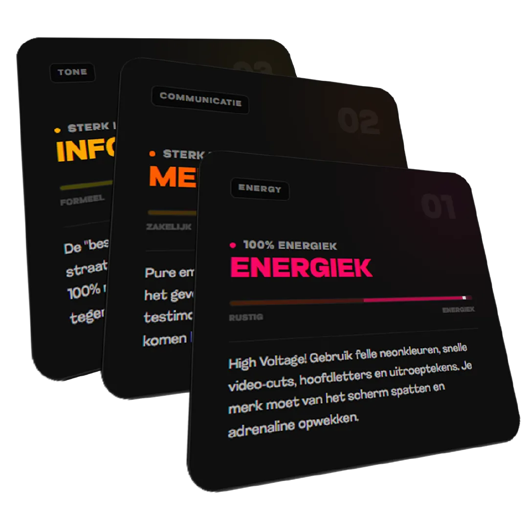 Leg je merkpersoonlijkheid vast met intuïtieve sliders. Zo wordt jouw branding sneller, consistenter en beter verdedigbaar richting je klant.